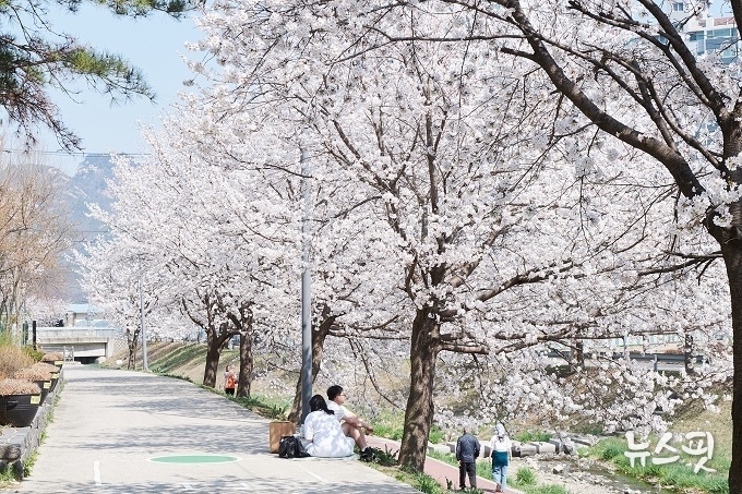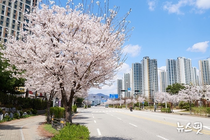 (뉴스핏 = 김수진 기자) 벚꽃이 만개한 양주시 도심과 공원 일대 벚꽃길이 주말 나들이 코스로 주목받고 있다. 주요 산책로와 도로변에 사진을 찍는 시민들 모습이 눈에 띈다.