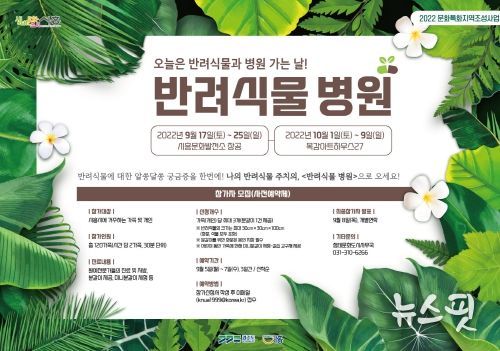 (뉴스핏 = 박선화 기자) 시흥시가 문화특화지역조성사업의 일환으로, 2022 공동체 협력사업 '반려식물 병원'을 오는 9월과 10월 각각 시흥문화발전소 창공, 목감아트하우스27에서 운영한다고 22일 밝혔다.