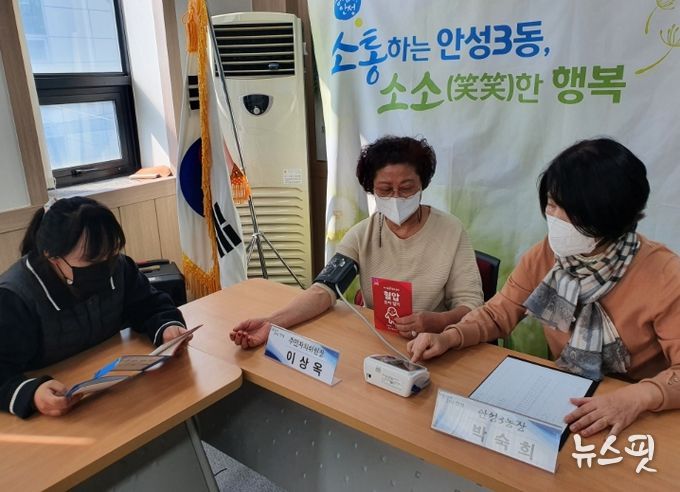 (뉴스핏 = 박선화 기자) 안성시 안성3동은 특수시책의 일환으로 지난 26일, 지역주민의 자기 건강관리 능력을 향상시키고자 기관사회단체 회원을 대상으로 혈압을 체크해주는 시간을 마련했다.