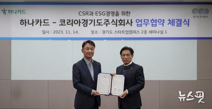 경기도주식회사는 14일 경기도 성남시 경기스타트업캠퍼스에서 조영완 경기도주식회사 사업본부장, 이석 하나카드 디지털금융그룹장, 민경석 글로벌사업부장 등이 참석한 가운데 하나카드와 ‘CSR(기업의 사회적 책임)과 ESG(친환경, 사회적 책임 경영, 투명 경영) 경영을 위한 업무협약(MOU)’을 체결했다.