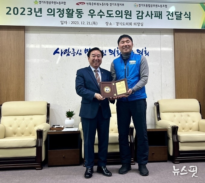 경기도 3개 노조(경기도청공무원노동조합·전국공무원노동조합 경기도청지부·경기도통합공무원노동조합)는 21일 ‘2023년 의정활동 우수 경기도의원’으로 김성남 농정해양위원장을 선정, 감사패를 수여했다. 경기도 3개 노조는 리더십, 도덕성, 청렴성, 비전제시, 도민을 위한 소신 있는 정책 결정, 공정하고 투명하나 의정활동 추진 등을 갖춘 우수 도의원들을 선정하고 있으며, 특별히 올해는 경기도청 3개의 노조가 통합으로 진행했다.