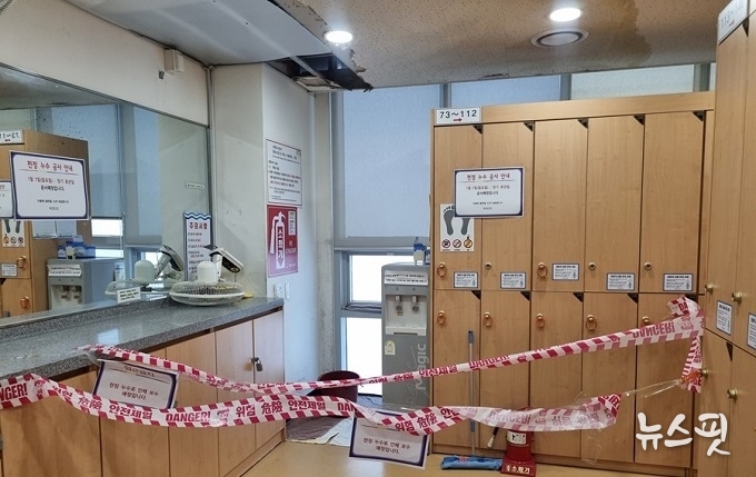 이들이 현장에 직접 나가 시설물을 점검한 결과, 2층 여성 탈의실 천정이 누수로 인해 상당 부분 훼손되었고, 훼손된 구간의 사물함은 사용 금지와 출입제한을 하고 있는 것으로 확인됐다.