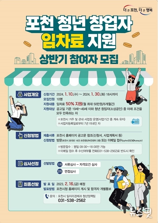 (뉴스핏 = 박선화 기자) 포천시는 오는 10일부터 30일까지 창업 초기 청년들의 안정적인 정착을 위해 ‘청년 창업자 임차료 지원사업’ 상반기 참여자 10명을 모집한다.