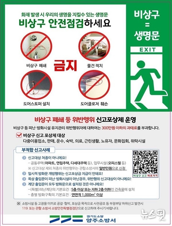 (뉴스핏 = 박선화 기자) 양주소방서는 화재 안전관리 강화를 위해 비상구 폐쇄 등 소방시설 불법행위 신고포상제를 연중 운영한다고 11일 밝혔다.
