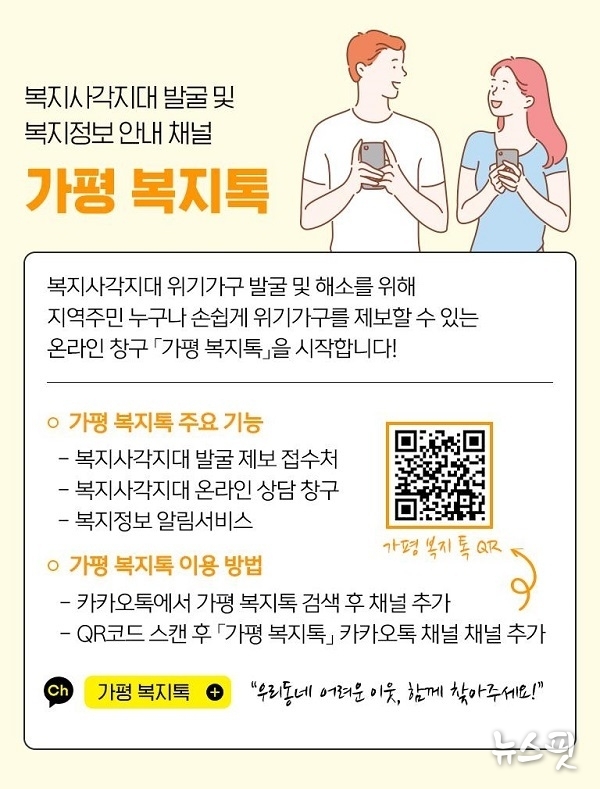 (뉴스핏 = 박선화 기자) 가평군은 복지사각지대 위기가구 발굴 및 해소를 위해 지역주민 누구나 손쉽게 위기가구를 제보할 수 있는 ‘가평 복지톡’을 신설 운영하고 있다.