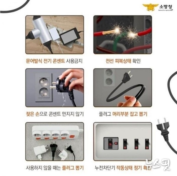 이에 소방서는 전기화재를 예방하기 위해 ▲문어발식 전기 콘센트 사용금지 ▲사용하지 않는 전기제품의 전원을 끄고 플러그 제거하기 ▲젖은 손으로 콘센트 만지지 않기 ▲플러그 머리 부분 잡고 뽑기 ▲전선 피복 손상에 따른 합선 예방하기 등을 당부했다.