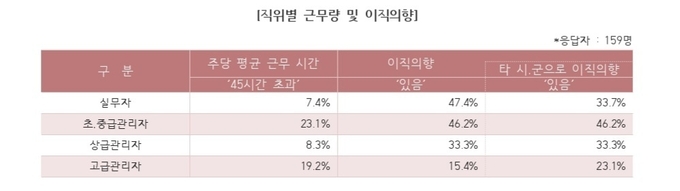대표적으로 시설 유형 간 월급여 차이를 들 수 있는데, ‘생활지도원/사회복지사/4급(1호봉)’을 기준으로 살펴봤을 때 노인복지시설은 290만원, 장애인복지시설 230만원, 직업재활시설 277만원, 장애인거주시설 247만원 내외로 장애인거주시설 근무자의 월 급여가 장애인복지시설 근무자의 76.1%에 불과했다. 더불어 타 시설로의 이직의향이 실무자급 47.4%, 초·중급 관리자급 46.2%에 달해 직위별 종사자 이탈 가능성에 대한 대응의 필요성 또한 확인됐다.