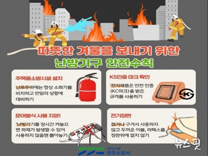 (뉴스핏 = 박선화 기자) 경기 양주소방서는 날씨가 추운 겨울철 난방기기 사용이 급증하는 시기를 맞아 3대 전기 난방용품의 사용과 관련한 화재 예방에 각별한 주의를 당부했다.
