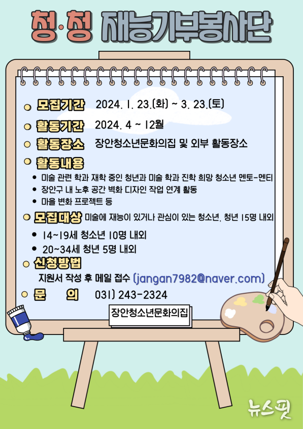 (뉴스핏 = 박선화 기자) 수원시청소년청년재단 장안청소년문화의집은 미술에 재능이 있거나 관심 있는 청소년과 청년들이 함께하는 ‘청·청 재능기부 봉사단’ 단원을 모집한다고 26일 밝혔다.