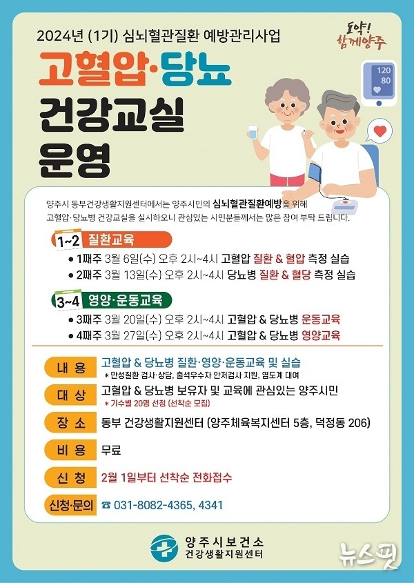 (뉴스핏 = 박선화 기자) 양주시보건소 동부 건강생활지원센터에서는 양주시민의 심뇌혈관질환 예방을 위해 만성질환 보유자 및 교육에 관심 있는 시민을 대상으로 ‘고혈압·당뇨병 건강교실’대상자를 모집한다고 29일 밝혔다.
