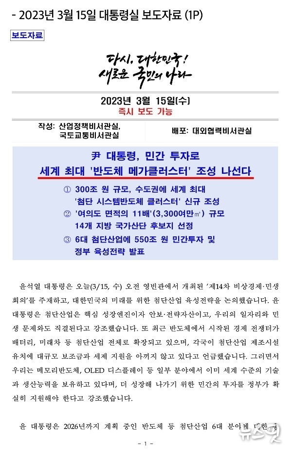 당시 산업통상자원부·국토교통부는 보도참고자료 4페이지에서 '대규모 신규 민간투자는 2042년까지 300조원(※이후 360조원으로 늘어) 규모로 단일 단지기준 세계 최대규모의 새로운 '첨단 시스템반도체 클러스터'를 경기도내(※용인 이동·남사읍 국가산단을 뜻함)에 조성할 계획이다', '신규 클러스터(※용인 국가산단을 의미)가 조성되면 기존 생산단지(기흥,화성,평택,이천 등) 및 인근 소부장 기업, 팹리스 벨리(판교)를 연계한 세계 최대 반도체 메가 클러스터가 완성될 것으로 기대한다'라고 밝혔다.