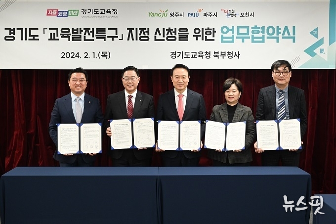 (뉴스핏 = 박선화 기자) 강수현 양주시장이 1일 경기도교육청 북부청사에서 경기도교육청, 경동대학교, 서정대학교, 예원예술대학교와 함께 ‘교육발전특구’ 시범지역 지정을 위한 업무협약을 체결했다.