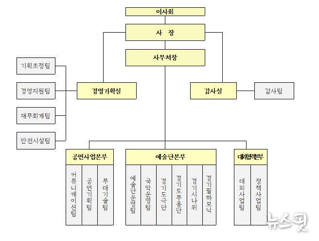 우선 경기아트센터의 경영파트와 사업파트를 명확히 구분해 정책결정을 간결하게 만들었다. 또한 신속한 업무처리를 위해 경영기획실(구, 경영본부)이 사장직속실로 직제가 변동됐다.