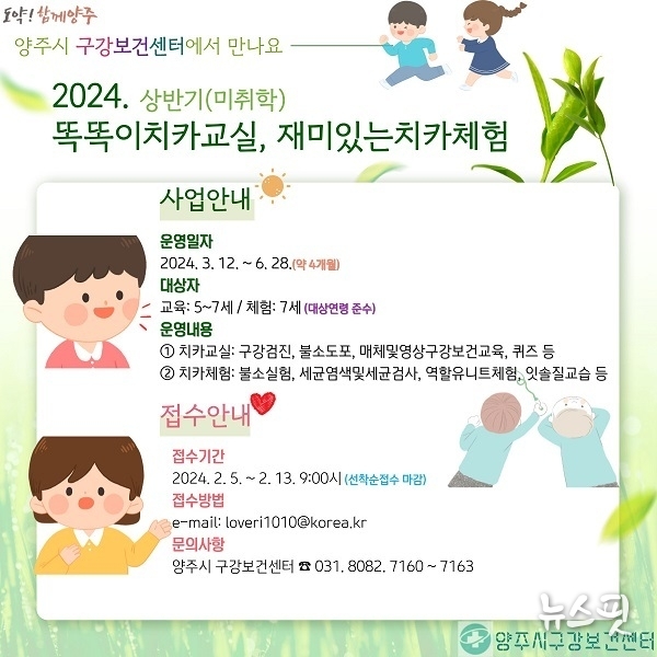 (뉴스핏 = 박선화 기자) 양주시는 오는 13일까지 ‘구강보건센터’에서 ‘상반기 똑똑이 치카 교실 및 재미있는 치카 체험’ 프로그램 신청을 받는다고 12일 밝혔다.