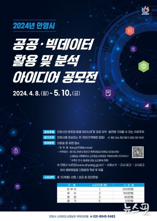 (뉴스핏 = 김수진 기자) 안양시가 다음달 10일까지 공공데이터를 분석하거나 활용한 참신한 정책 아이디어를 모집한다고 8일 밝혔다.