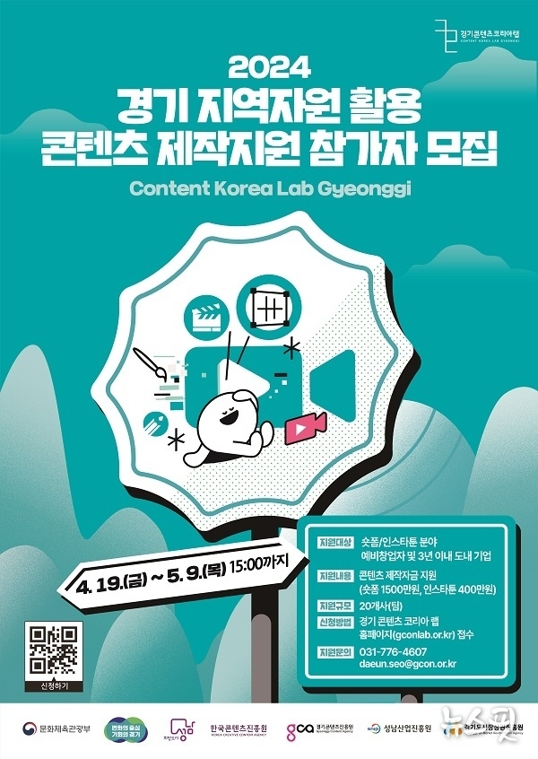 (뉴스핏 = 김수진 기자) 경기도와 성남시가 설립하고 경기콘텐츠진흥원(원장 탁용석, 이하 경콘진)이 운영하는 경기 콘텐츠코리아 랩에서 ‘경기 지역자원 활용 콘텐츠 제작지원’사업에 참가할 예비 창업자 또는 3년 이내 창업자 20팀을 5월 9일까지 모집한다.