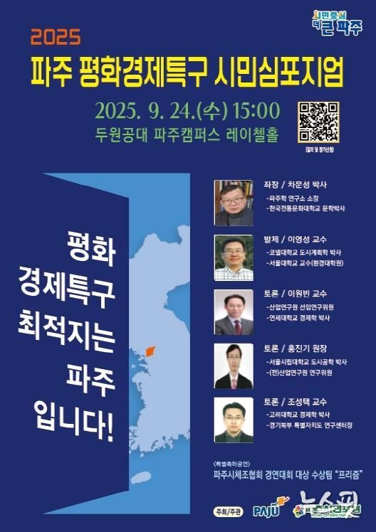 파주시가 주최하고 파주시민포럼이 주관하는 이 행사는 시민과 전문가가 함께 모여 파주 평화경제특구 조성의 실행방안과 발전 전략을 폭넓게 논의하는 자리다.
