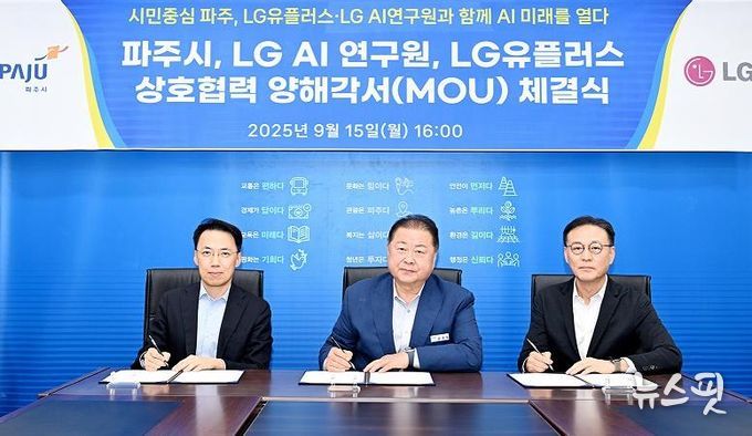 (뉴스핏 = 김호 기자) 파주시는 지난 9월 15일, 시청 접견실에서 엘지에이아이(LG AI)연구원, 엘지(LG)유플러스와 ‘인공지능(AI) 혁신 협력 업무협약(MOU)’을 체결했다고 밝혔다.