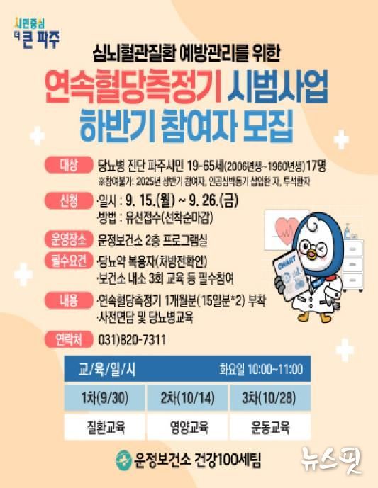 (뉴스핏 = 김수진 기자) 파주시 운정보건소는 심뇌혈관질환 예방관리사업의 일환으로 9월 15일부터 2주간 하반기 ‘연속혈당측정기 시범사업’ 대상자를 모집한다.