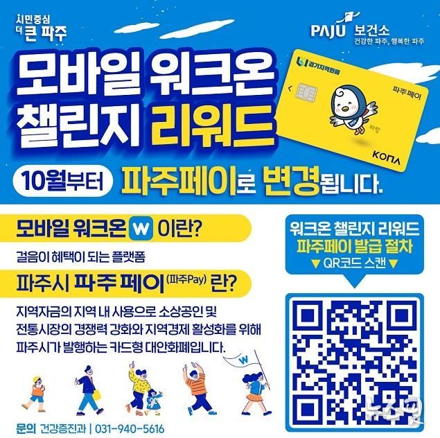 (뉴스핏 = 김수진 기자) 파주보건소가 시민 건강 증진과 지역경제 활성화를 위해 모바일 걷기 앱 ‘워크온 보상’ 지급 방식을 오는 10월부터 지역화폐 파주페이로 전환해 운영한다.
