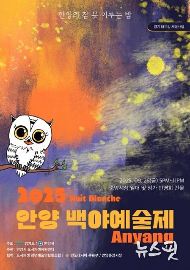 (뉴스핏 = 김수진 기자) 안양시는 오는 26일 오후 5시부터 11시까지 만안구 안양4동 안양중앙시장에서 청년들이 즐길 수 있는 ‘안양 백야예술제(Nuit Blanche Anyang)’를 개최한다고 19일 밝혔다.