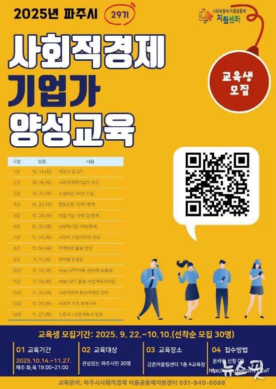 (뉴스핏 = 김호 기자) 파주시는 사회적가치 실현을 위한 사회적경제 생태계 확산을 목표로 ‘2025년 하반기 사회적경제 기업가 양성 교육’을 운영한다.