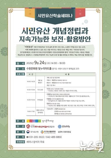 (뉴스핏 = 김수진 기자) 경기문화재단은 오는 10월 24일 오후 2시, 수원문화원 빛누리아트홀에서 ‘시민유산 개념정립과 지속가능한 보전·활용방안’ 학술 세미나를 개최한다고 밝혔다. 세미나는 문화유산을 소수 전문가의 영역에서 시민 모두의 유산으로 확장하고, 그 가치를 지속가능하게 보전, 활용하는 방안을 모색하기 위해 기획됐다.