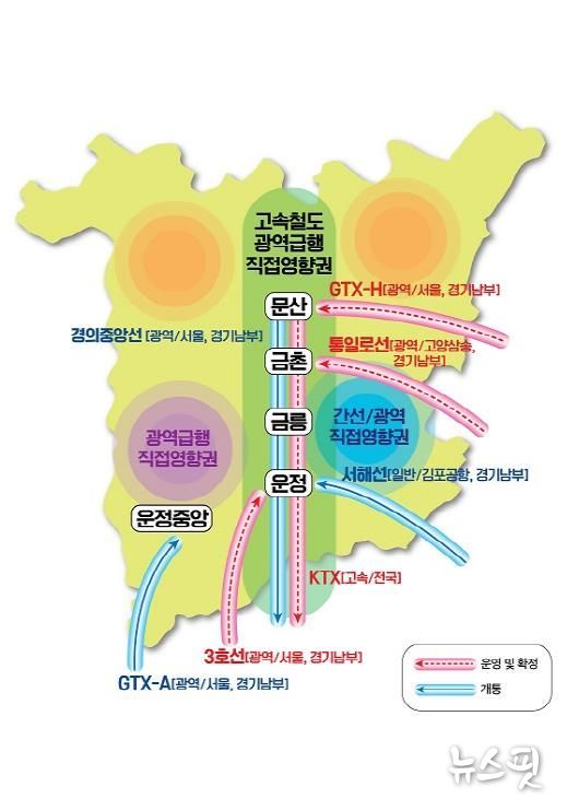 시는 그 밖에도 경의선 금촌역에 복합환승센터를 건립해 ‘지하철 3호선’과 케이티엑스(KTX) 파주 연장, ‘통일로선’ 전철, 수도권광역급행철도(GTX)-에이치(H) 노선 등의 광역 철도망이 ‘제5차 국가철도망 구축계획’에 포함될 수 있도록 총력을 기울일 방침이다.