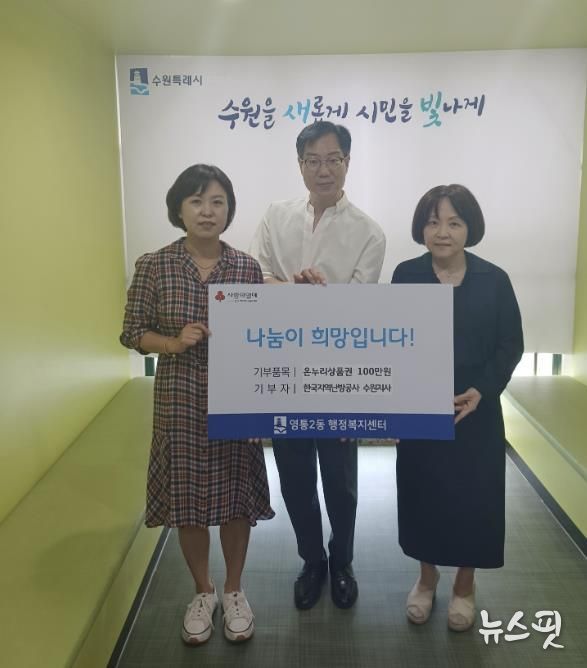 (뉴스핏 = 김호 기자) 한국지역난방공사 수원지사는 지난 23일 추석 명절을 맞이하여 영통2동 관내 어려운 이웃들을 위해 온누리상품권 100만원을 영통2동 행정복지센터에 전달했다.