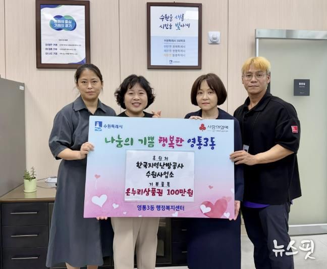 (뉴스핏 = 김호 기자) 수원특례시 영통3동은 지난 20일, 영통3동 소재 한국지역난방공사 수원사업소으로부터 추석 명절을 맞이하여 온누리상품권 100만원을 기탁받았다고 밝혔다.