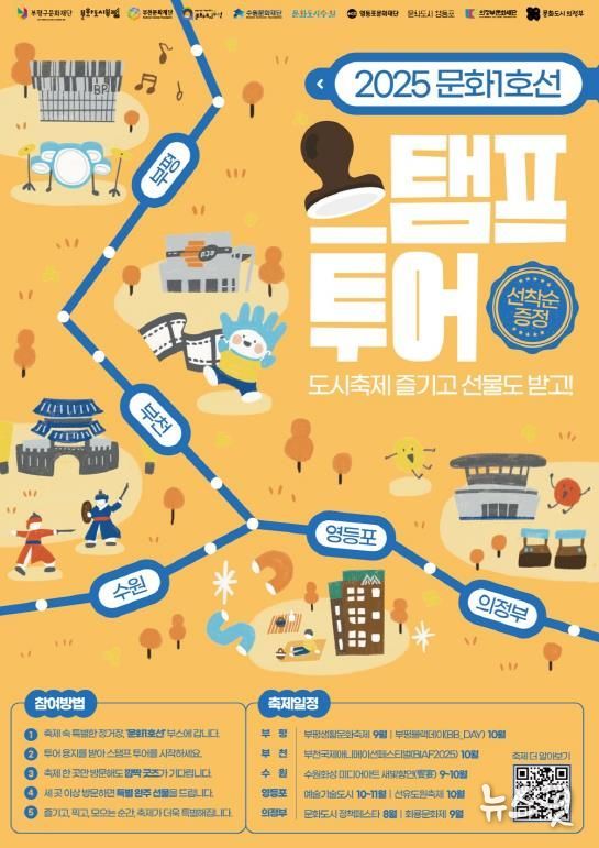 ‘2025 문화1호선 스탬프 투어’는 수도권 대표 문화도시들이 연대해 만든 협력형 프로젝트로, 수원문화재단, 부평문화재단, 부천문화재단, 영등포문화재단, 의정부문화재단이 공동으로 주최하는 문화도시 간 협업사업의 일환이다. 시민들에게는 도시의 문화 향유 기회를 제공하고, 나아가 각 도시의 축제를 연결하는 문화 네트워크를 강화하며, 지역 브랜드 가치를 높여 지속 가능한 문화도시 모델을 확산하는 데 기여할 것으로 기대한다.