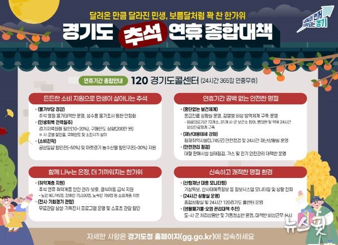 (뉴스핏 = 김수진 기자) 경기도는 도민 모두가 안전하고 넉넉한 추석을 보낼 수 있도록 10월 3일부터 10월 9일까지 7일간 ‘추석 연휴 종합대책’을 추진한다. 도는 종합상황실을 24시간 운영하고 비상근무 체계를 가동해 연휴 중 발생할 수 있는 불편과 사고에 신속 대응할 방침이다.