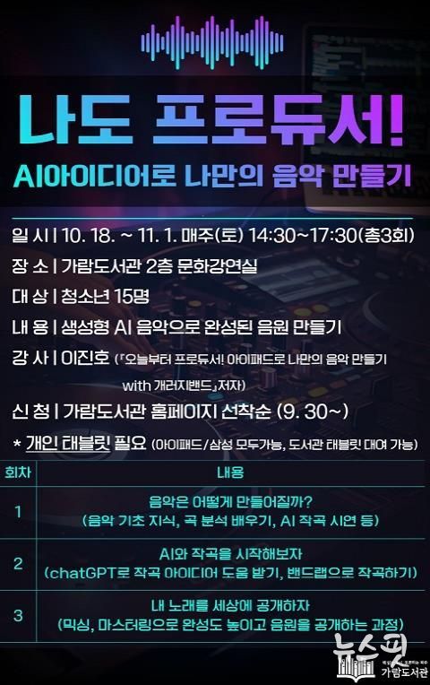 이번 프로그램은 인공지능(AI)과 디지털 도구를 활용해 직접 음악을 제작하는 활동으로, 11월 1일까지 매주 토요일 14시 30분, 총 3회에 걸쳐 진행된다. 장소는 가람도서관 문화강연실이며, 지역 청소년 15명이 참여할 수 있다.
