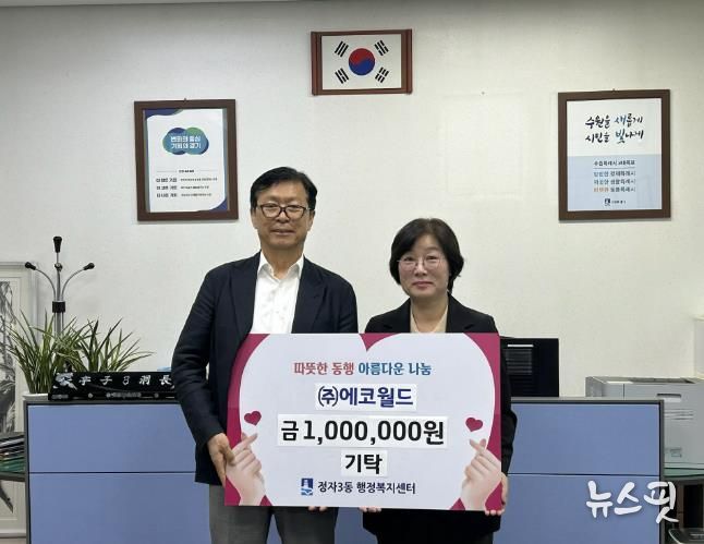 (뉴스핏 = 김호 기자) 주식회사 에코월드는 지난 29일, 추석 명절을 앞두고 수원시 장안구 정자3동에 이웃돕기 성금 100만원을 기탁했다. 이번 기부금은 명절을 맞아 도움이 필요한 우리 이웃들에게 소중히 전달될 예정이다.