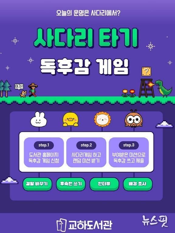 (뉴스핏 = 김호 기자) 파주시 교하도서관은 오는 10월 2일부터 11월 30일까지, 게임형 독후감 미션을 접목한 독서진흥 프로그램 ‘독후감 게임’을 운영한다.