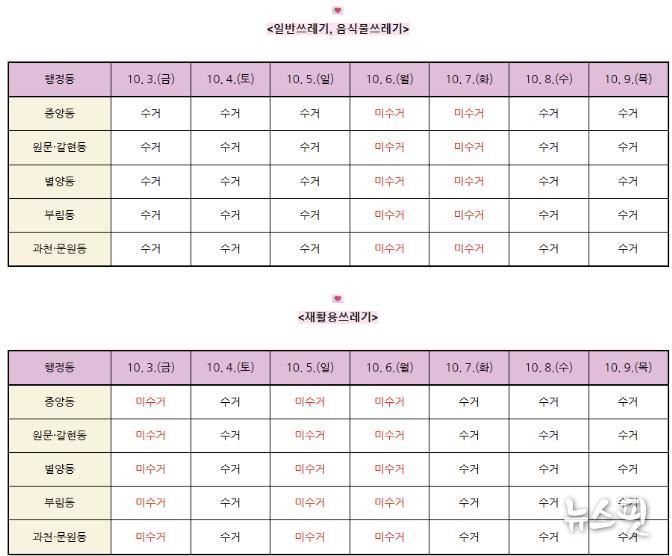 생활폐기물 수거는 일반 쓰레기의 경우 3일, 4일, 5일, 8일, 9일에, 재활용 쓰레기는 4일, 7일, 8일, 9일에 각각 수거된다.