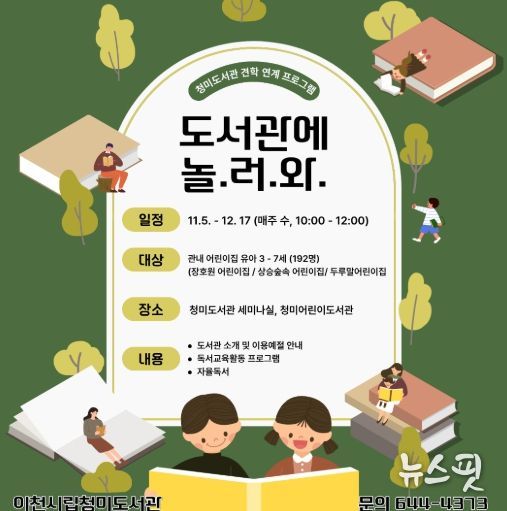 (뉴스핏 = 김수진 기자) 이천시 청미도서관은 오는 11월 5일부터 12월 17일까지 관내 어린이집 유아를 대상으로 도서관 견학 연계 프로그램 ‘도서관에 놀.러.와. 시즌2’를 운영한다.