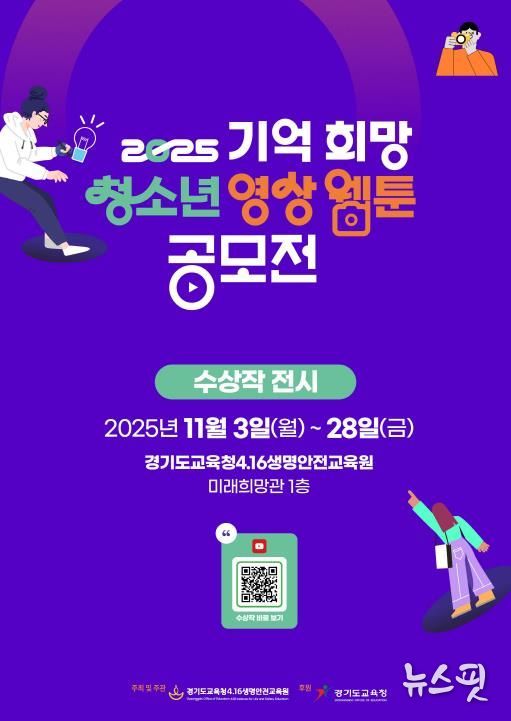 3일부터 28일까지 경기도교육청4.16생명안전교육원 미래희망관 1층 전시공간에서 진행되는 이번 전시에서는 영상 부문 10점, 웹툰 부문 10점 등 총 20점의 작품을 선보인다.