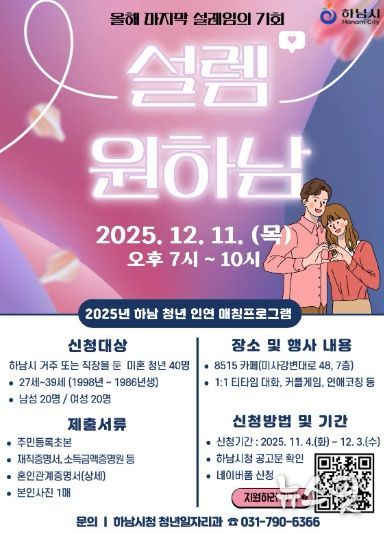 이현재 시장은 “설렘원하남은 단순한 소개 행사가 아니라 청년들이 대화를 통해 서로의 가치관을 공유하고 건강한 만남을 이어갈 수 있도록 돕는 교류의 장이 될 것”이라며 “이번 행사는 청년의 제안에서 출발해 실제로 진행되는 만큼, 연말에 색다른 경험을 원하는 청년들의 적극적인 참여를 바란다”고 말했다.