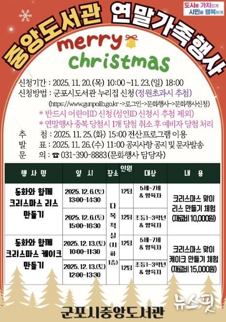 (뉴스핏 = 김수진 기자) 군포시 중앙도서관은 연말을 맞이하여 도서관이 시민들에게 더욱 친근한 문화공간이 되어 가족 간의 따뜻한 추억을 쌓게 하고자 연말가족행사를 마련했다.