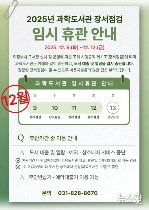 (뉴스핏 = 김호 기자) 의정부과학도서관은 소장 자료의 상태와 보유 현황을 체계적으로 점검하기 위해 12월 9일부터 12일까지 4일간 임시 휴관한다고 10일 밝혔다.