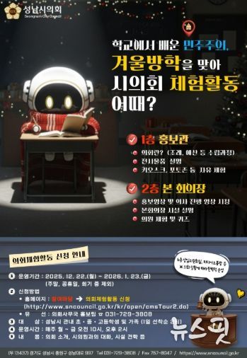 (뉴스핏 = 김수진 기자) 성남시의회는 겨울방학을 맞아 관내 초·중·고등학생과 가족을 대상으로‘가족과 함께하는 겨울방학 의회 체험활동’을 오는 22일부터 2026년 1월 23일까지 운영한다.