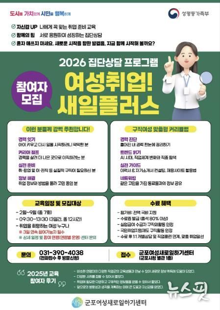 (뉴스핏 = 김수진 기자) 군포여성새로일하기센터(군포시청 별관 1층)는 지역 내 여성들의 성공적인 사회 진출과 경력 이음을 돕기 위해 ‘2026년 집단상담 프로그램: 여성취업! 새일플러스’ 참여자를 모집한다고 밝혔다.