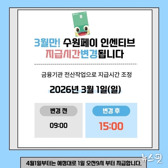 수원페이 인센티브 지급 시작 시각은 매달 1일 오전 9시였지만, 3월 1일 금융기관 전산 작업으로 인해 오후 3시로 늦춰진다. 4월부터는 다시 1일 오전 9시부터 지급한다.