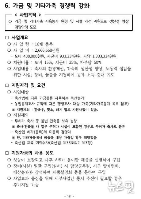 ‘가금 및 기타가축 사육농가 지원사업’은 시설 현대화를 통한 축사 환경 개선, 방역 물품 지원 등을 통한 생산성 향상이 주요 내용이다.