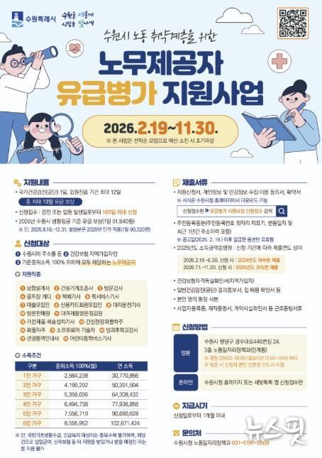 수원시는 11월 30일까지 ‘2026년 노동취약계층 노무 제공자 유급병가 지원사업’ 신청을 받는다.