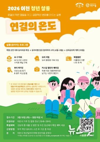 (뉴스핏 = 김호 기자) 이천시 청년일자리카페 청년이룸(이천시 경충대로 2701-32)은 지역 청년들의 관계망 형성 및 역량 강화를 위한 청년이룸 네트워킹 데이 ‘연결의 온도’ 참가자를 10일부터 모집한다고 밝혔다.