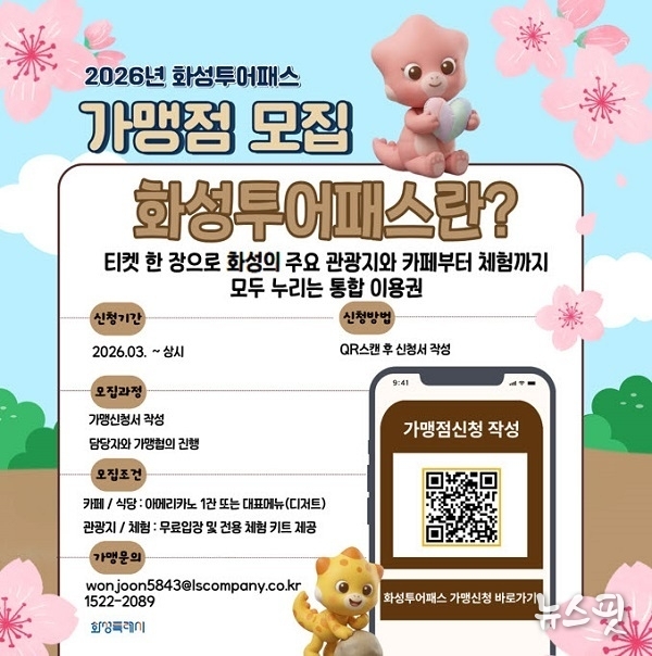 화성특례시 관계자는 “다채롭고 개성 있는 지역 업체들을 발굴해 관광객들에게 화성의 숨겨진 매력을 널리 알리고자 한다”며 “지역 소상공인과 상생할 수 있는 화성 투어패스 가맹점 모집에 많은 관심과 참여를 부탁드린다”고 전했다.