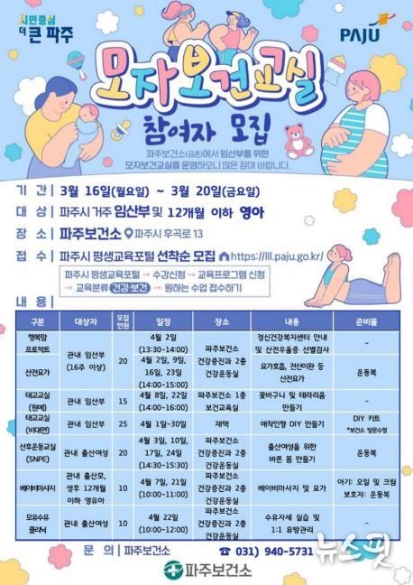 (뉴스핏 = 김수진 기자) 파주보건소는 건강한 임신과 출산, 행복한 육아를 지원하기 위해 4월부터 운영하는 ‘모자보건 프로그램’참여자를 모집한다.