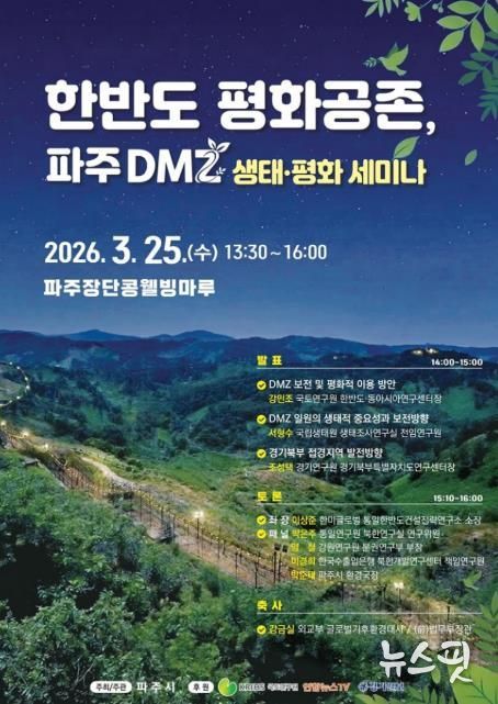 (뉴스핏 = 김수진 기자) 파주시는 오는 25일 13시부터 16시까지 파주장단콩웰빙마루(탄현면 필승로 396) 2층에서 ‘한반도 평화공존, 파주 디엠지(DMZ) 생태·평화 세미나’를 개최한다.